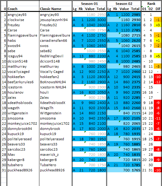 smozoma Posted September 3, 2010 Report Posted September 3, 2010 IIHF Rankings as of the completion of the Season 2 playoffs! Most people's rankings went down due to a lot of good new coaches joining for season 2 (i went from 10th to 21st!) Since there are only 2 seasons, I made this season worth 70% and last season worth 30% (usually it's 40/30/20/10 over 4 seasons). AJ enters the standings at #1. Freydey (+3 to 3rd), habs (+1 to 6th), and iceguy94 (+5 to 8th) are the only coaches to improve their rankings. vocallycaged and houlanov managed to hold steady at 12th and 16th, respectively. How it works: At the end of each season, you get points. The values of the top 10 positions: Rk Value Dif 1 1200 +40 2 1160 +40 3 1120 +20 4 1100 +40 5 1060 +20 6 1040 +20 7 1020 +20 8 1000 +40 9 960 +20 10 940 +20 From 11 onwards the difference is always 20 points Each playoff series win, the teams get 'reseeded' in the rankings, so in the end, the champion is 1st, runner up 2nd, and semi-finalists 3rd and 4th based on Pts%. The remaining spots are filled in based on regular season performance. The top two B coaches, I rank ahead of the bottom 2 A coaches in each season. Same for C/B. Missing past seasons are filled in using the next more recent season's point value minus 20. Missing 'future' seasons are filled in with a somewhat complicated formula that slowly decays their ranking. Missing interim seasons are filled in with an average of the next nearest seasons. The TOTAL VALUE is calculated by adding the values from each previous season, but previous seasons depreciate according to this table: Example: Value of 1st place Season 1: 100% value -- 1200 points Season 2: 75% value -- 900 points Season 3: 50% value -- 600 points Season 4: 25% value -- 300 points Season 5: 0% value -- 0 points Quote
